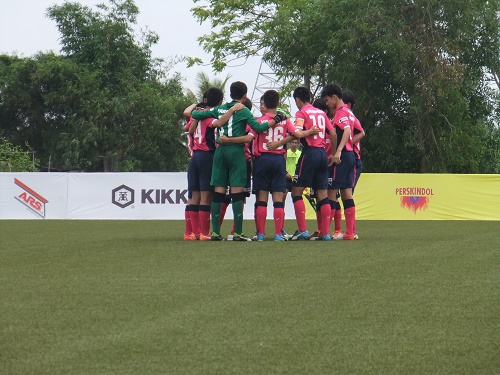 今日も気温が35度を超える中、ピッチに出て円陣を組む選手たち