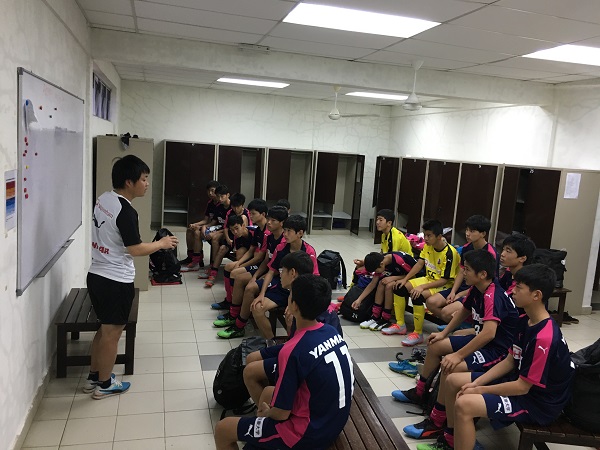 試合前のミーティングで昨日の反省を生かすこと、そのためにも強いメンタリティーの必要性を共有します。負けられない試合ということで真剣な表情でミーティングを聞く選手たち。