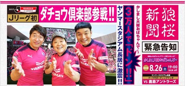 「大阪のおばちゃん」代表のマダム・ロビーナに続き、ゲストの「たこやきレインボー」「オバチャーン」が来場ですでに盛り上がりをみせているところに、さらに東京から「ダチョウ倶楽部」が緊急参戦!3万人のご来場を目標としているこの試合で、ダチョウ倶楽部と【3万人のドン!】ネタでスタジアムに応援の激震を起こしましょう!