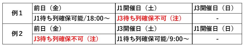 ※例2…J1の試合前日にJ3の試合が開催される場合は、J3開催日の9:00以降、待ち列確保が可能となります。