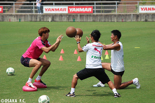トレーニング中のキム ジンヒョン選手。バランスの悪い状況でも、しっかりとボールをキャッチできるようにトレーニングに励んでいました。
