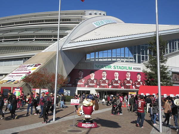 快晴のノエビアスタジアム神戸。モーヴィくんもお出迎え。
